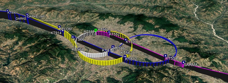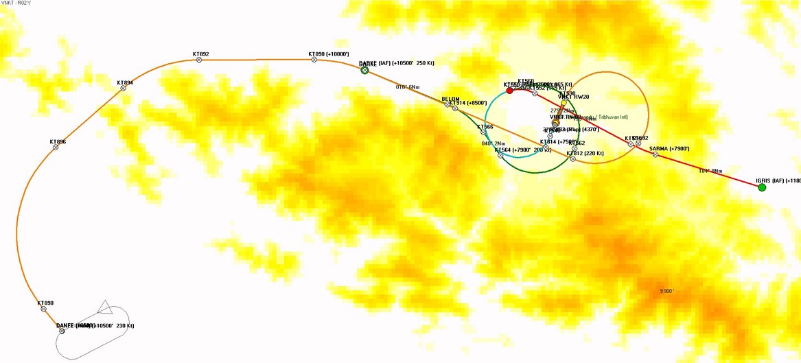 A funny complex approach in Katmandhu: (Diferent VIA to the final in white, in blue the biginning of the missed approach.)